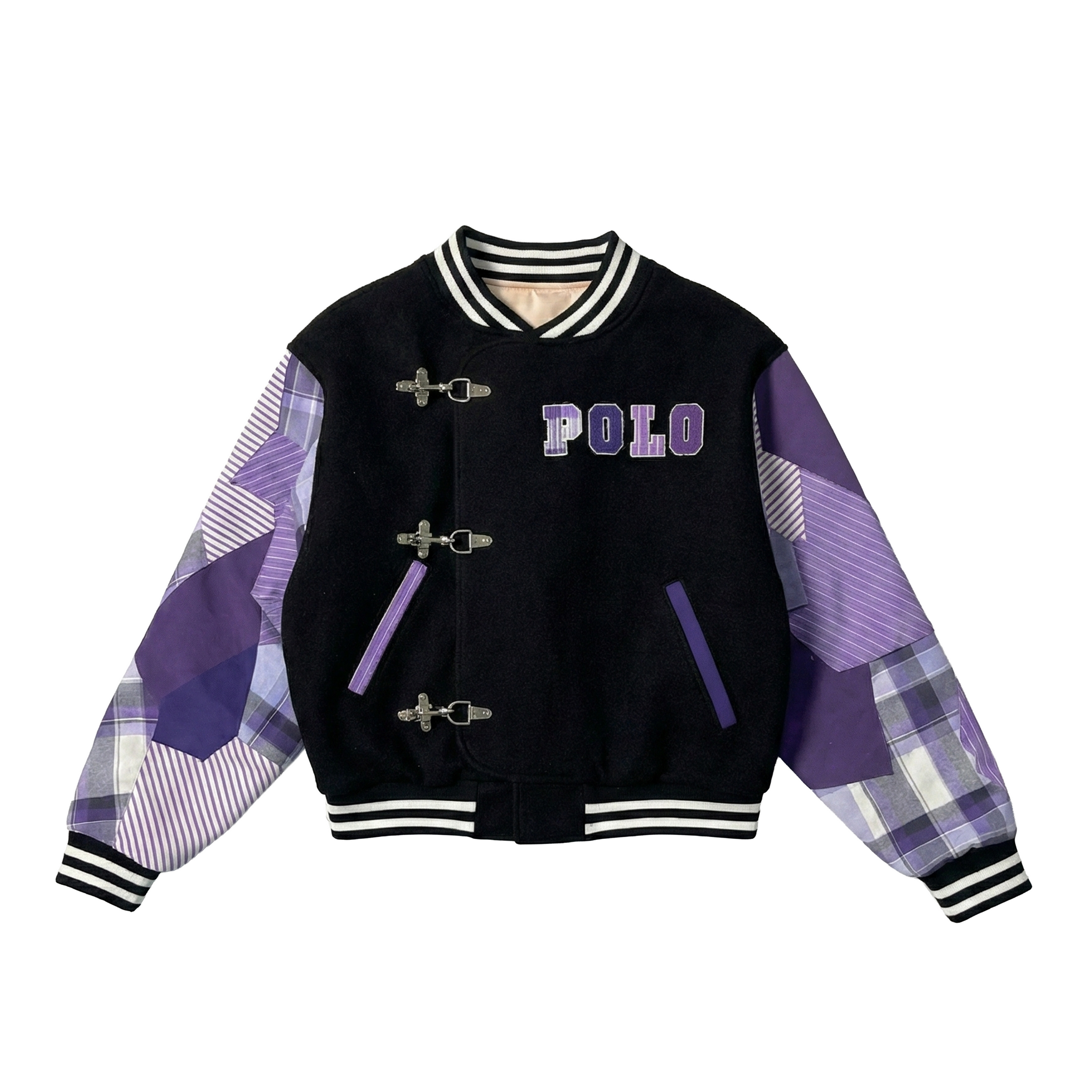 Cette veste universitaire a été faite à partir de 5 chemises vintage Ralph Lauren, de la laine bouillie, et du bord côte pour ces extrémités. Des boutons pression sont dissimulé pour permettre une fermeture optimal cumulé aux attaches pompier.